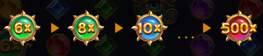 - 盤面清除後,倍數符號有機會升級,最高可達500倍。
