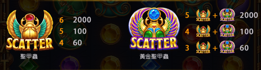 - 免費遊戲中,獲得3至6個SCATTER,即可觸發免費遊戲,並獲得5次免費場次,最多可達100次。