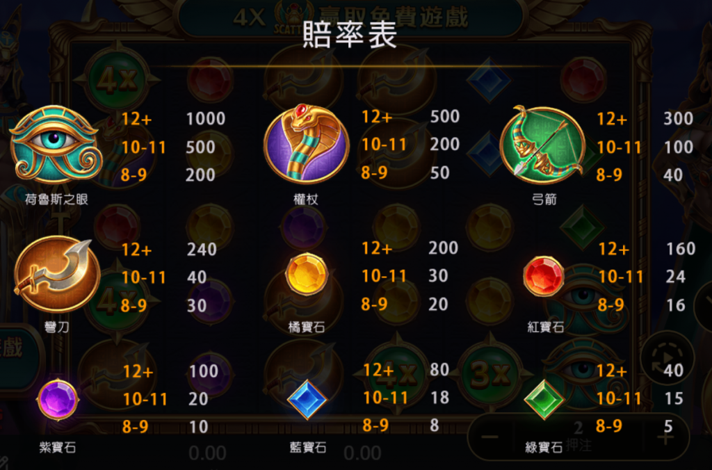 舉例:單次投注額為1,盤面獲得4個紅寶石SCATTER+1個藍寶石SCATTER