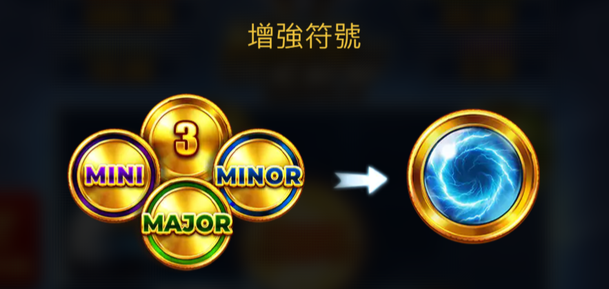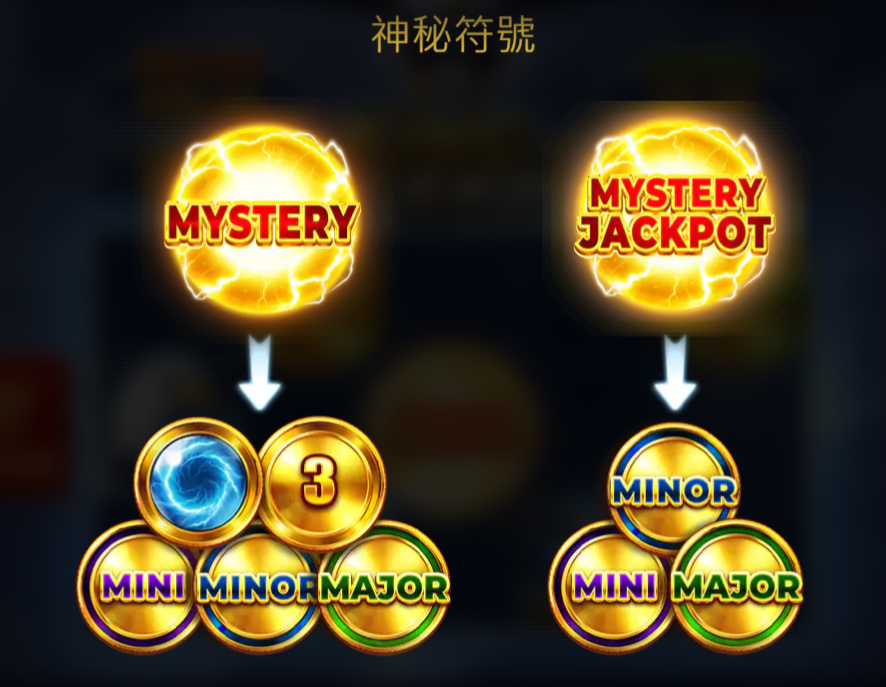 神秘圖示則以金色能量包裹,最終揭示出其真身:獎金、Boost 或 Jackpot 圖示;神秘 Jackpot 圖示會在 Bonus 回合結束時,以戲劇性的方式揭曉所有 Jackpot。