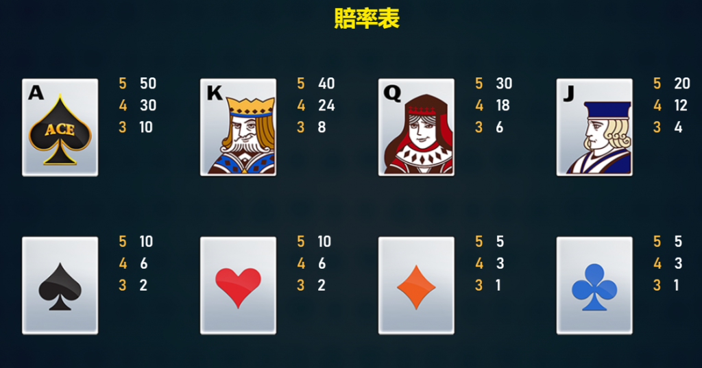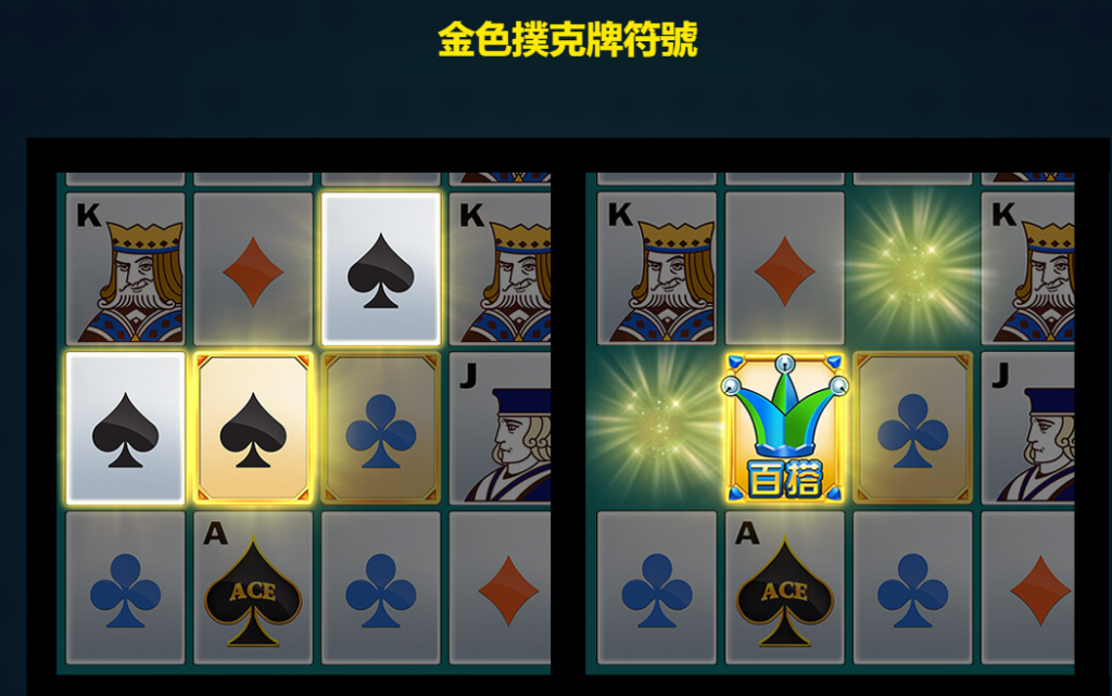 - 在每一輪新的符號掉落後,前一輪的贏分組合中的金色撲克牌將會被轉換為百搭符號。