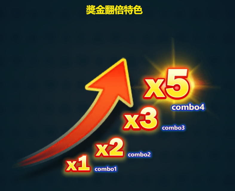 - 主遊戲中,第一輪贏分將使乘數從1倍開始增加,將可遞增至2倍、3倍、最多至5倍。