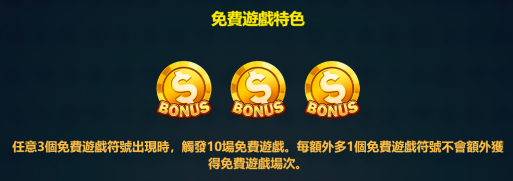 - 任意3個免費遊戲符號出現時,觸發10場免費遊戲。每額外多1個免費遊戲符號不會額外獲得免費遊戲場次。