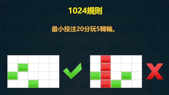- 遊戲規則 : 5 X 4 版面,1024路